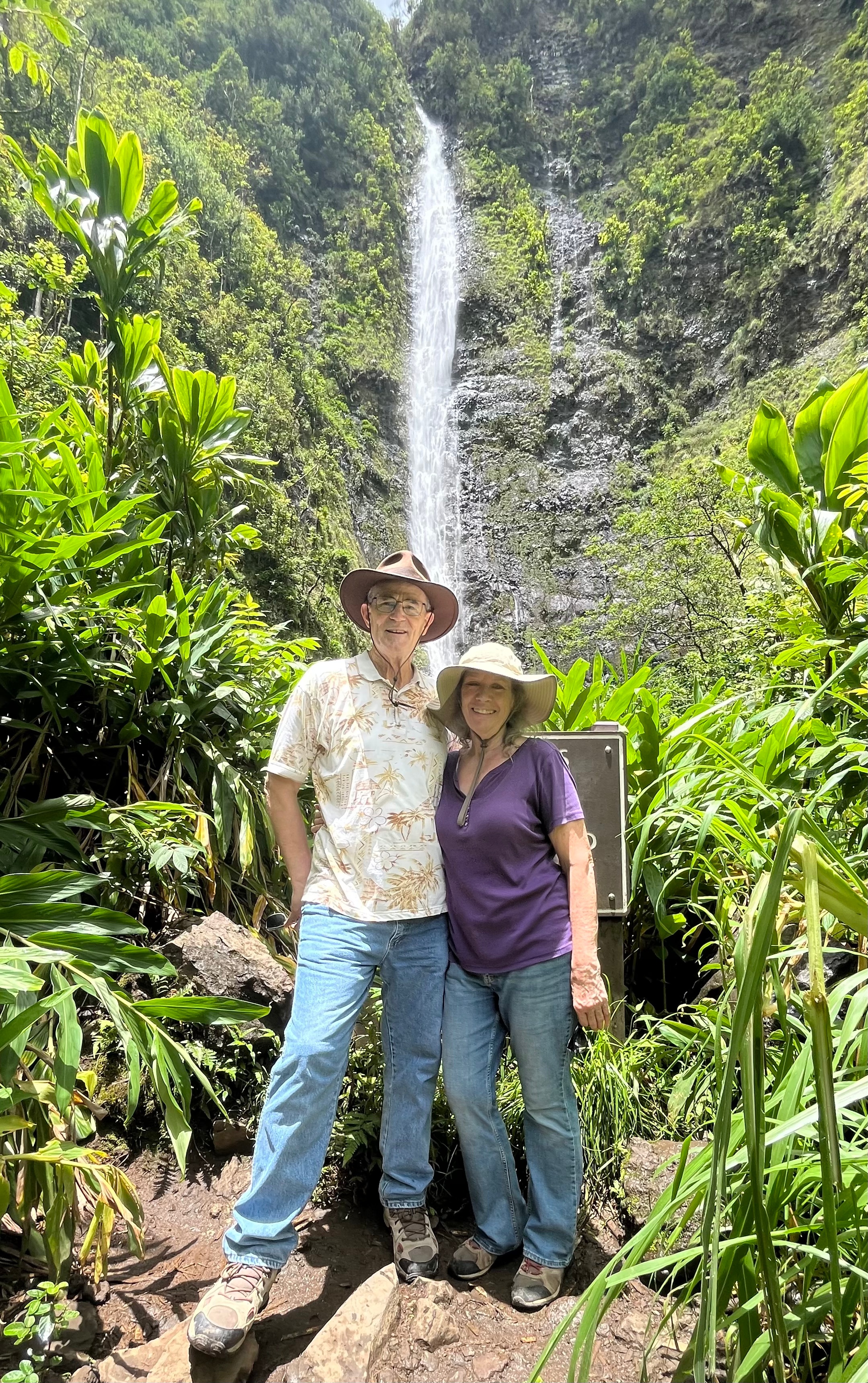 We take time every day for our own physical and emotional health. Adjacent to our apartment in Wailuku is a residential area called Wailuku Heights. I often make the 600-foot elevation gain hike to get my cardio exercise, then lift weights at home for resistance training. We occasionally use the apartment clubhouse gym and pool for exercise. This week Joan and I went on two significant hikes. I’ll speak of one of them now, and reserve the other for a future story. On the far east side of Maui is the small town of Hana which is reached after forty miles or so of winding road from Kahului, many narrow bridges, fresh banana bread shops, and ‘locals’ anxious to drive faster than the tourists (who are enjoying the many views, waterfalls, and seascapes). We pulled into The Church of Jesus Christ of Latter-day Saints chapel to eat the lunch we packed. Another ten miles past Hana along the coast is the lower part of the Haleakala National Park, Ohe’o Gulch, and the Seven Sacred Pools. The primary hike, the Pipiwai Trail, is two miles each way with a vertical rise of 650 feet, a large bamboo forest on the way, terminating at the base of Waimoku Falls which drops 400 feet down a sheer cliff. Looking up at this water fall is one of God’s many spectacular creations here on Maui.